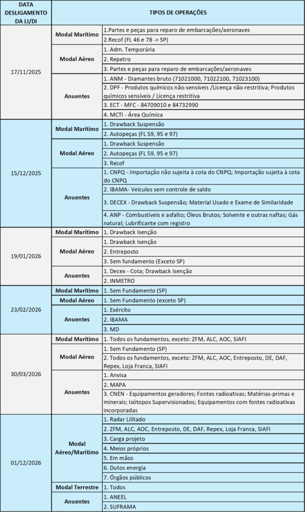 Dezembro de 2025 está previsto como mês para a conclusão da migração completa, quando o sistema LI/DI deixará de estar ativo para os casos em que a Duimp já possa ser usada.
